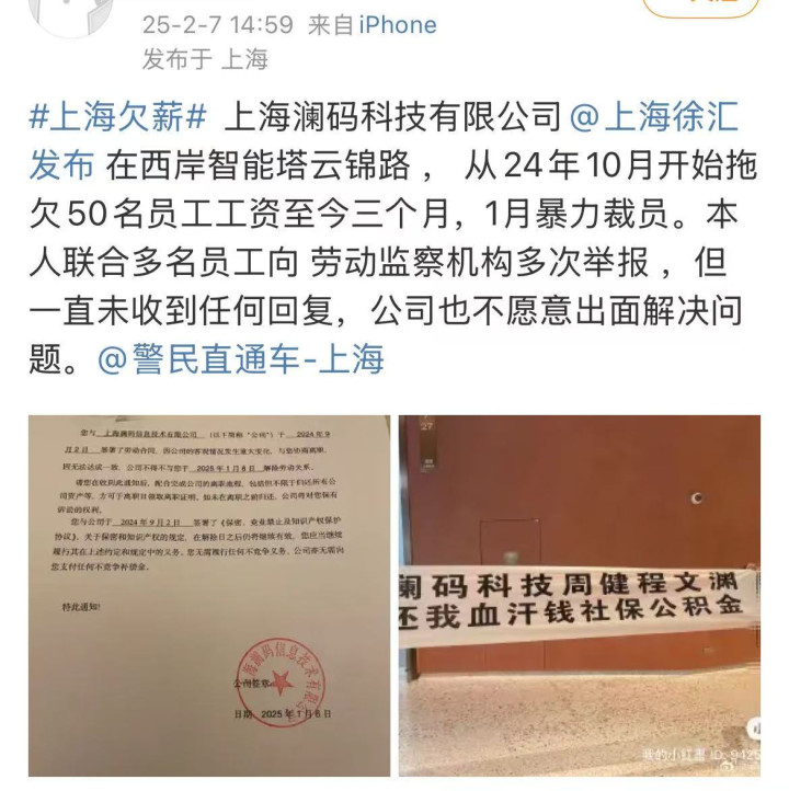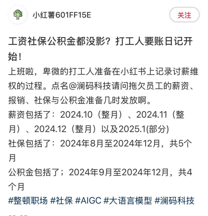 三言科技2月24日消息,近日有多名澜码科技员工在社交媒体讨薪。有员工透露被欠薪3个多月,未交社保5个月、公积金4个月。